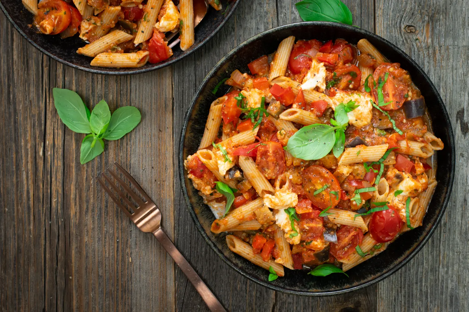 - Roer de kerstomaatjes en het verse basilicum door de saus. Schep er vervolgens voorzichtig de penne en tot slot de mozzarella doorheen. Werk eventueel af met wat extra verse basilicum en serveer meteen.
