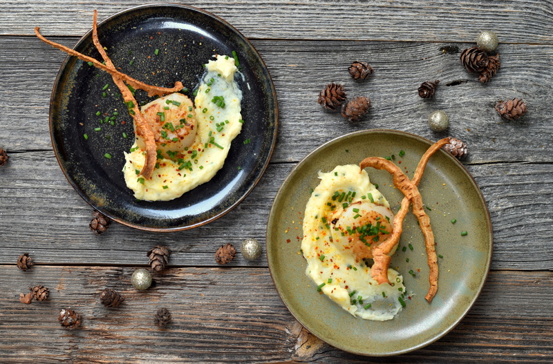 Ik ben zuinig met vis en zeevruchten. Het zijn kostbare ingrediënten die om een bewuste beleving vragen. Doordeweeks maak ik ze eigenlijk zelden of nooit klaar, maar als het feest is, mag het allemaal wat luxueuzer zijn. Coquilles of Sint-Jacobsnoten vind ik daar uitermate geschikt voor. Vooral omdat je ze heel makkelijk en snel tot in de perfectie kan bereiden. En oh, wat zijn ze heerlijk, met hun knapperige, goudbruine buitenkant en frisse, zijdezachte binnenste. Ik combineer ze hier met een smeuïge puree van pastinaak en raap. De ovengebakken chips van pastinaakschil zorgen voor wat crispiness. Om alles af te werken, zowel qua smaak en qua kleur, gebruik ik een Santa Maria mix van gedroogde kruiden en specerijen met onder meer saffraan, venkel en dille. De ultieme feestelijke toets!